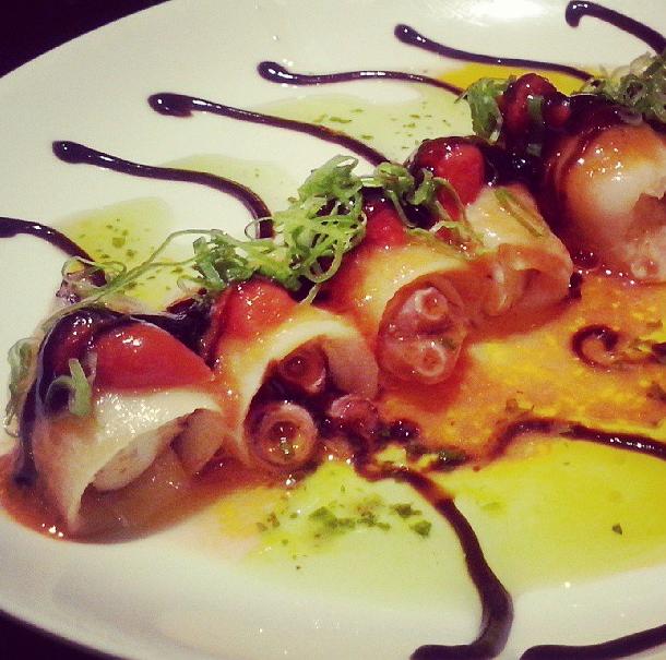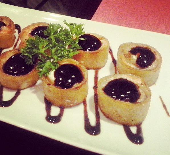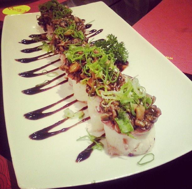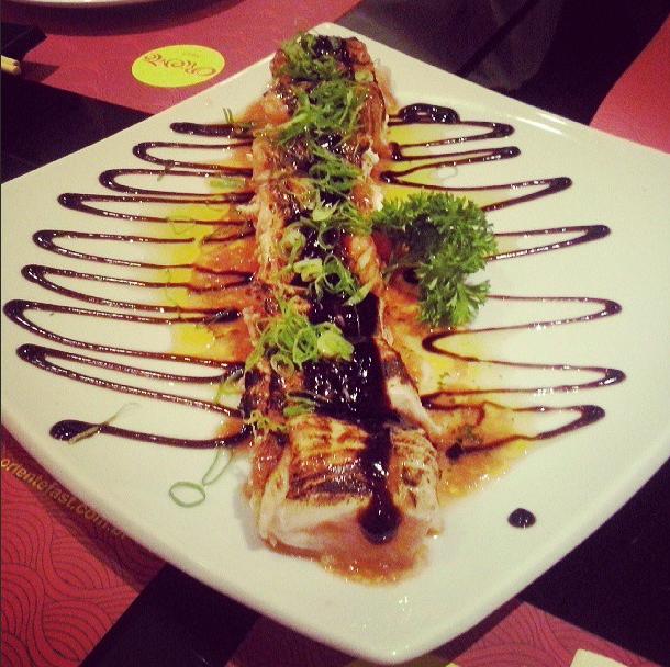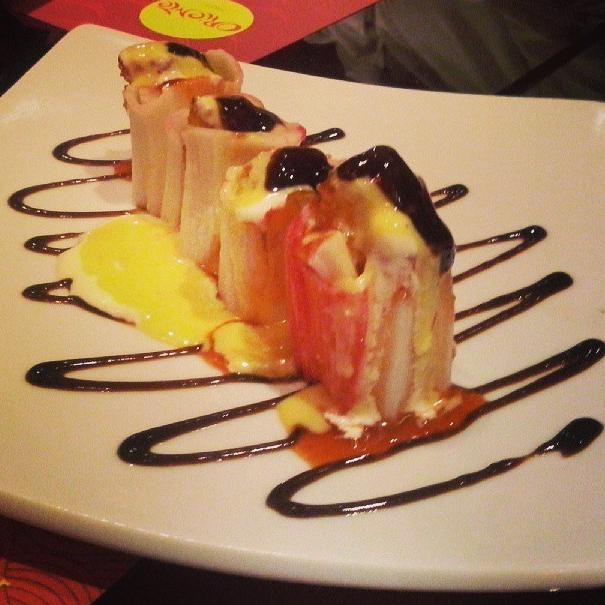 De entrada, tivemos os amados Mini Ceviche de Frutos do Mar (um dos nossos ceviches preferidos na cidade inteira), Nirá de Frutos do Mar (amamos) e Rolinhos Primavera e de Camarão. Já o desfile de pratos principais foi muito bem aberto pelo Oriente Maki (dispensa comentários só veja a foto abaixo), seguido pelos deliciosos Ebi Kani (mistura fantástica de kani e molho de manga), Fábio Maki (sucesso com direito a fogo e tudo), Hot Roll (crocante e sequinho), Takomaki, Ebi Maguro (quem curte shimeji e polvo vai à loucura), Shiromitako (um dos melhores da noite) e o exótico Hosomaki Especial (com geléia de morango e cream cheese). Além de show de sabor, o Oriente Fast dá show de apresentação em cada prato. Olha isso!