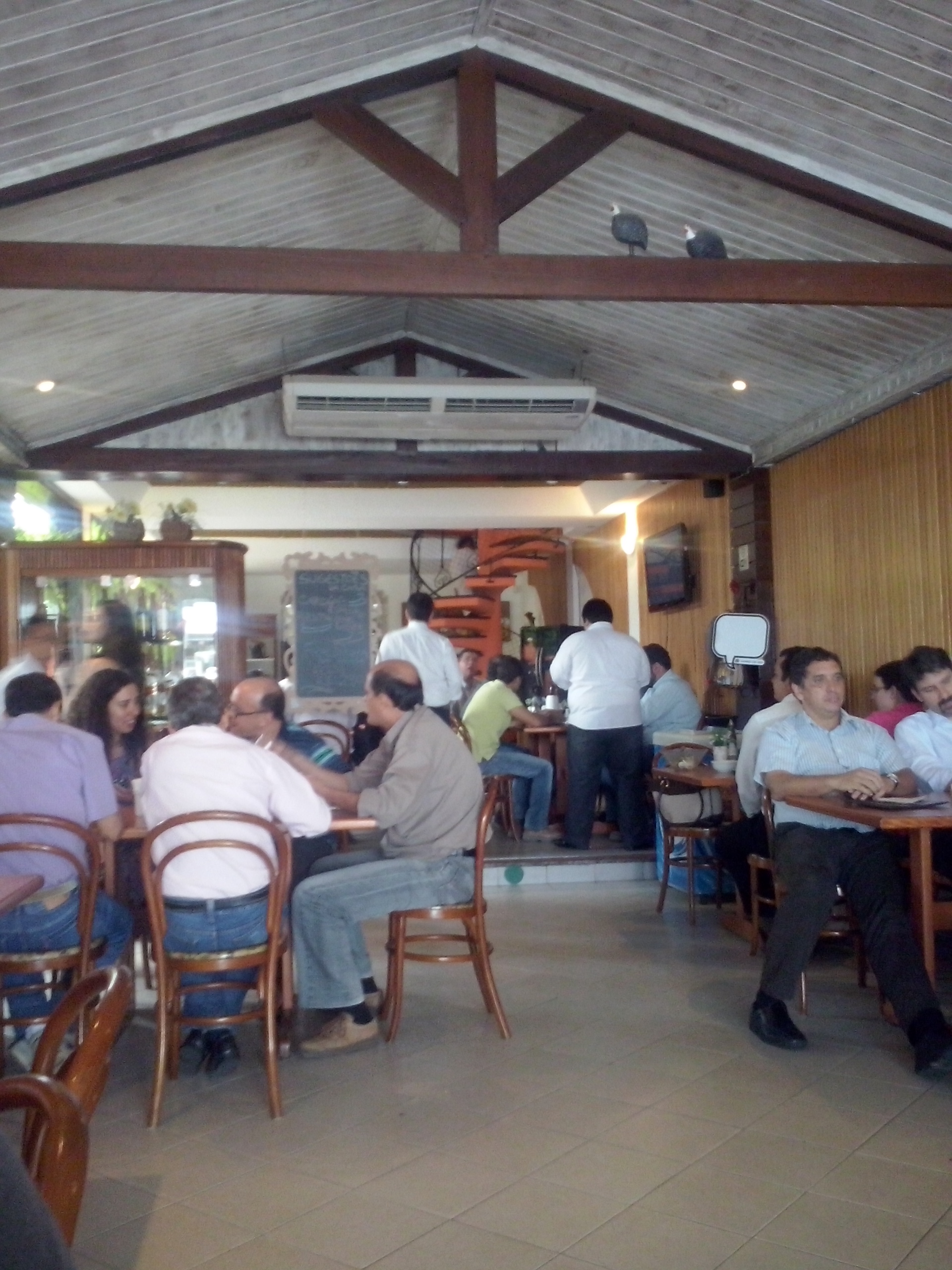 A ideia inicial era irmos no Frango do Moura, mas como o restaurante estava muito cheio, optamos pelo Carro de Boi, logo ao lado. Ao contrário do concorrente, o Carro de Boi tinha vários lugares disponíveis. De cara, achei o ambiente confortável e agradável, meio rústico, mas cheio de detalhes que aquecem o coração, como duas galinhas d’angola na estrutura do teto. Olha que graça.