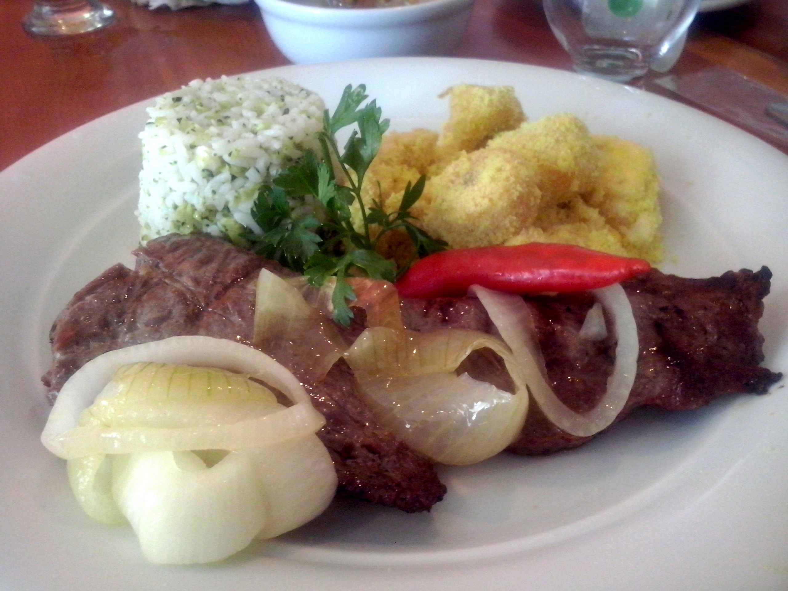 Prato principal: Maminha na chapa com farofa de ovo e banana e arroz OU Cordeiro das arábias (risoto).