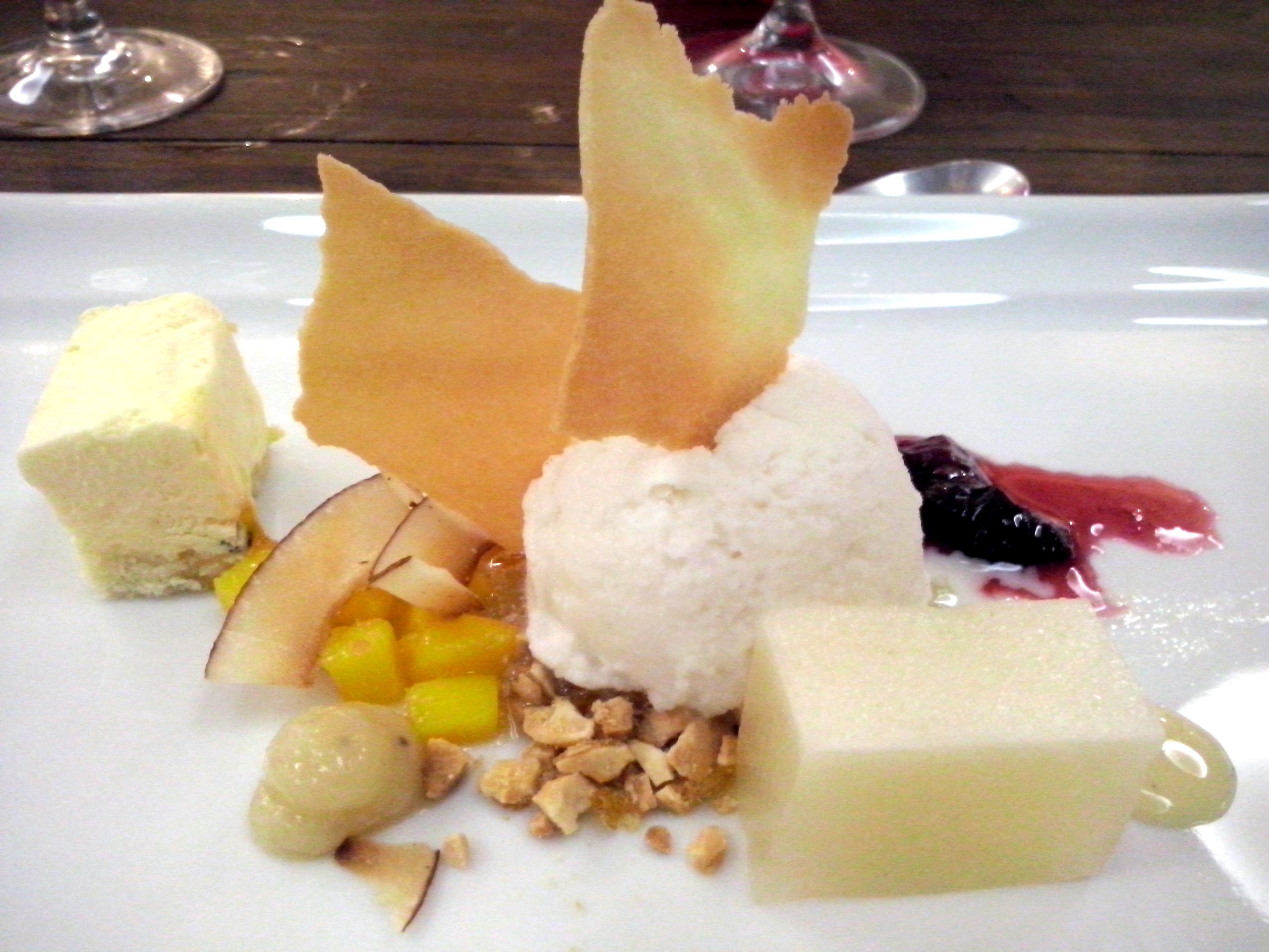 Frutas em Texturas – Sorvete de coco com farofa de coco, parfait de maracujá, pudim de abacaxi, couli de frutas vermelhas e mangas in natura.