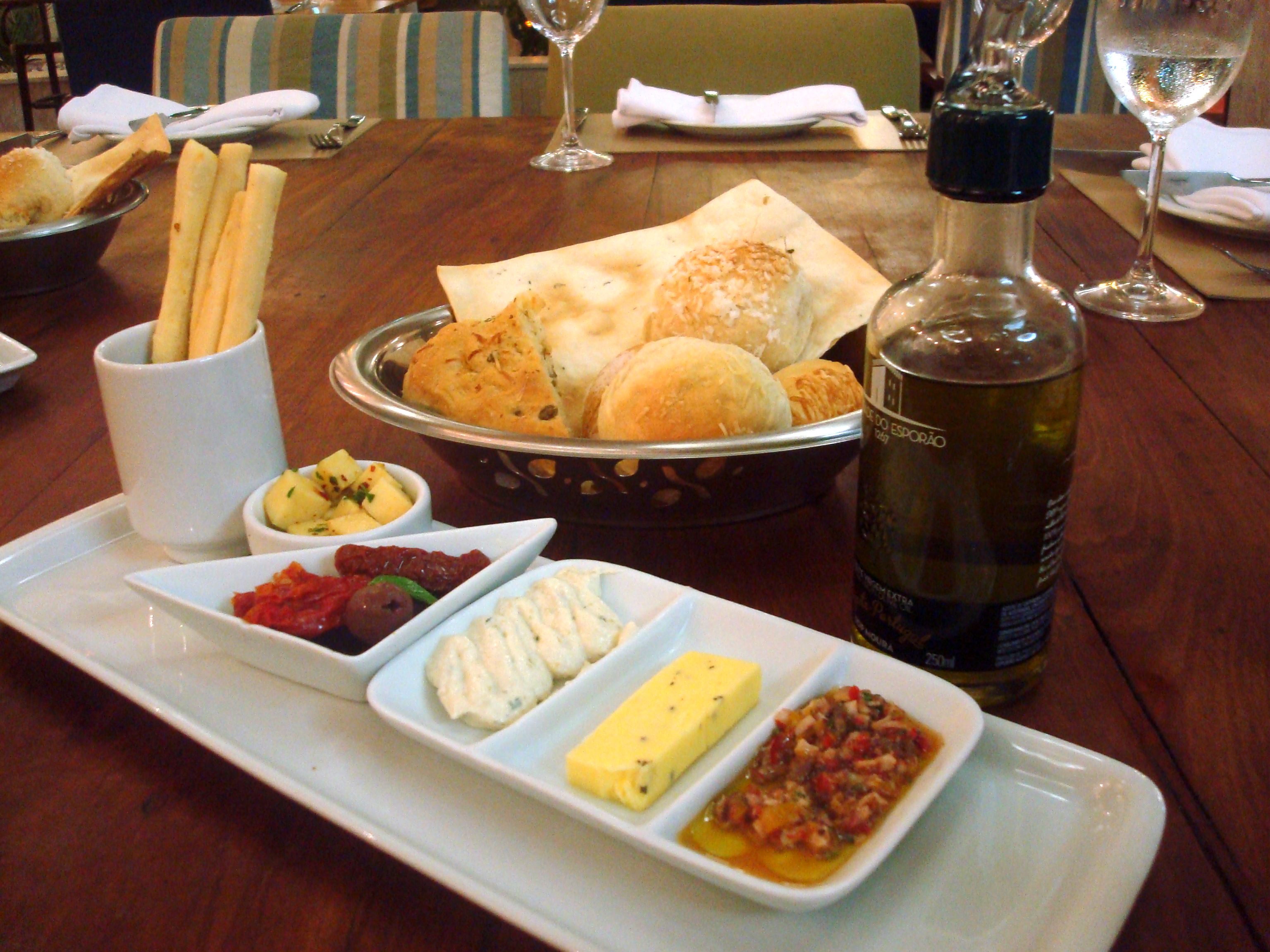 Abrimos a noite com um couvert simples mas muito saboroso de pães e antepasti. Destaque para a manteiga com ervas e o provolone apimentado.
