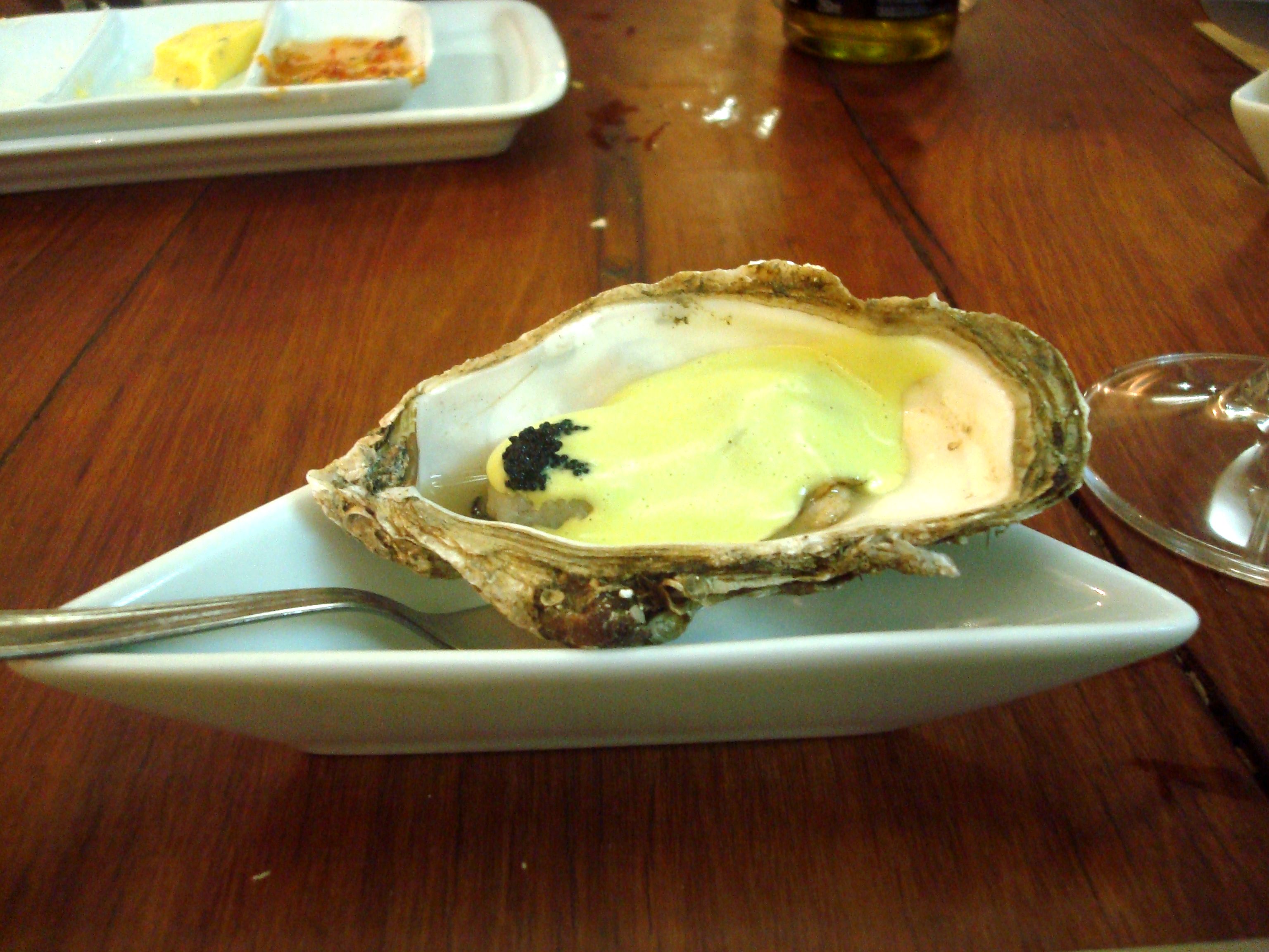 Ostra ao molho de manjericão (com ovas de peixe).