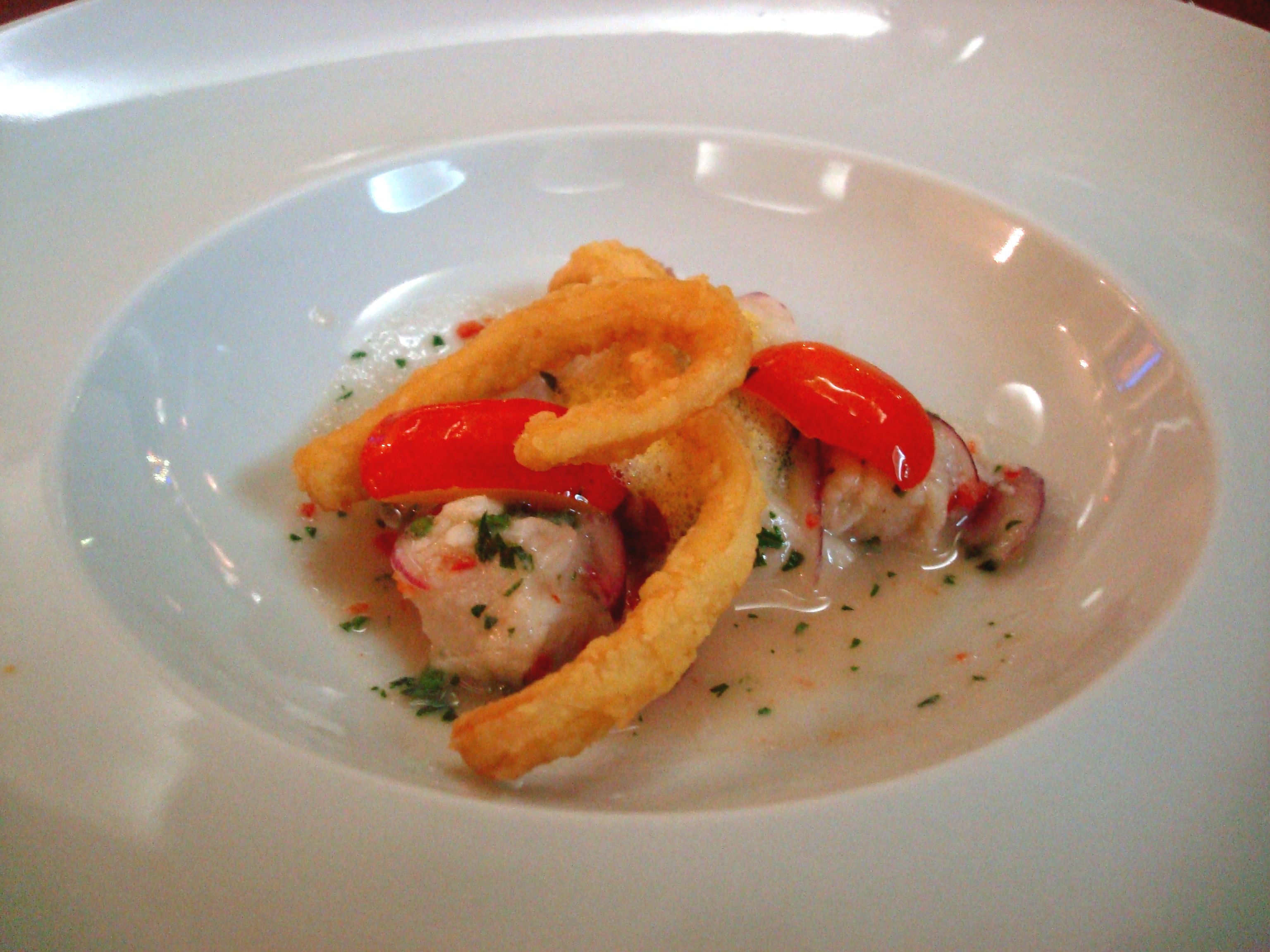 Ceviche de Robalo (com espuma de cajá e crocante de lula).
