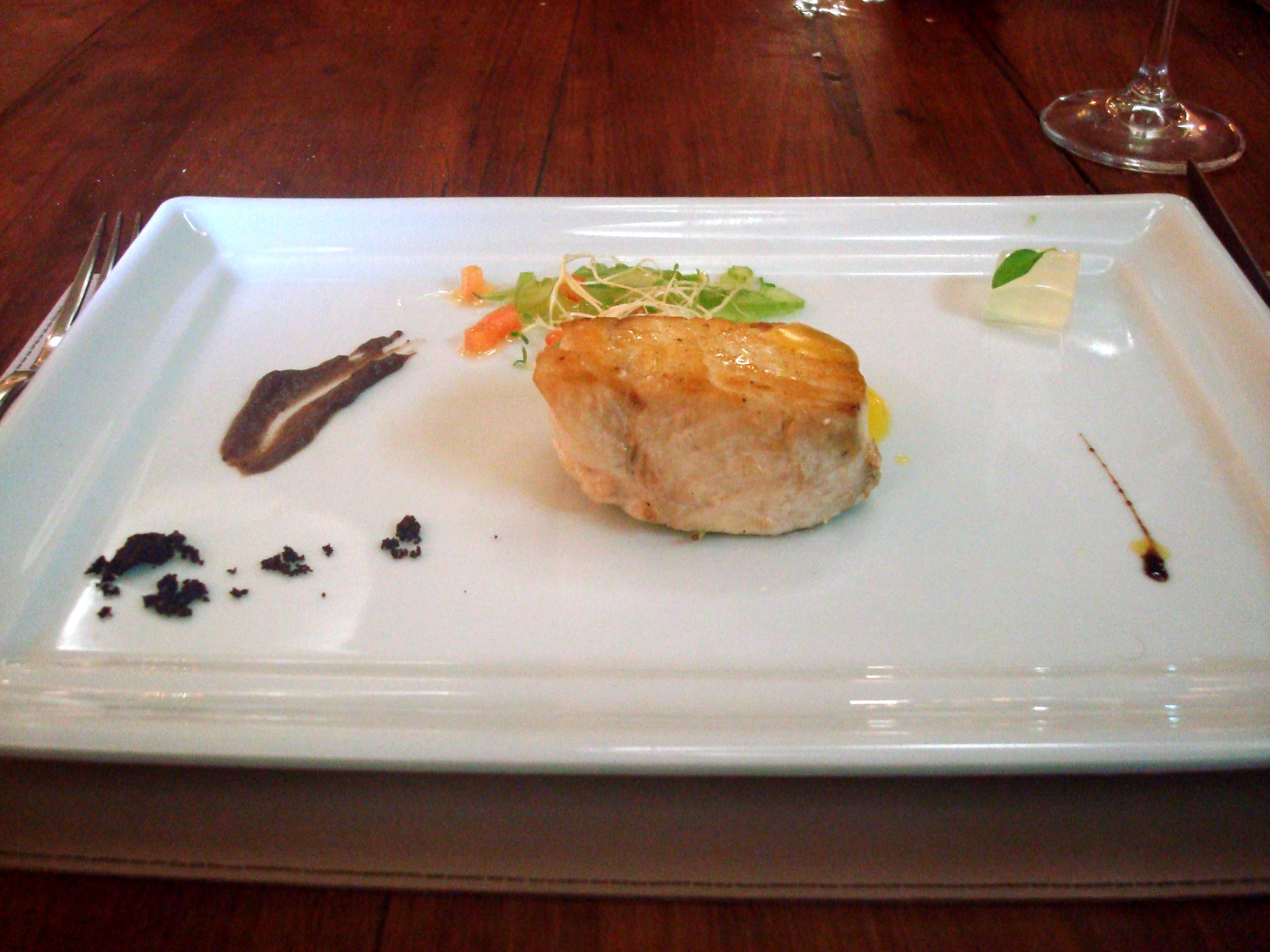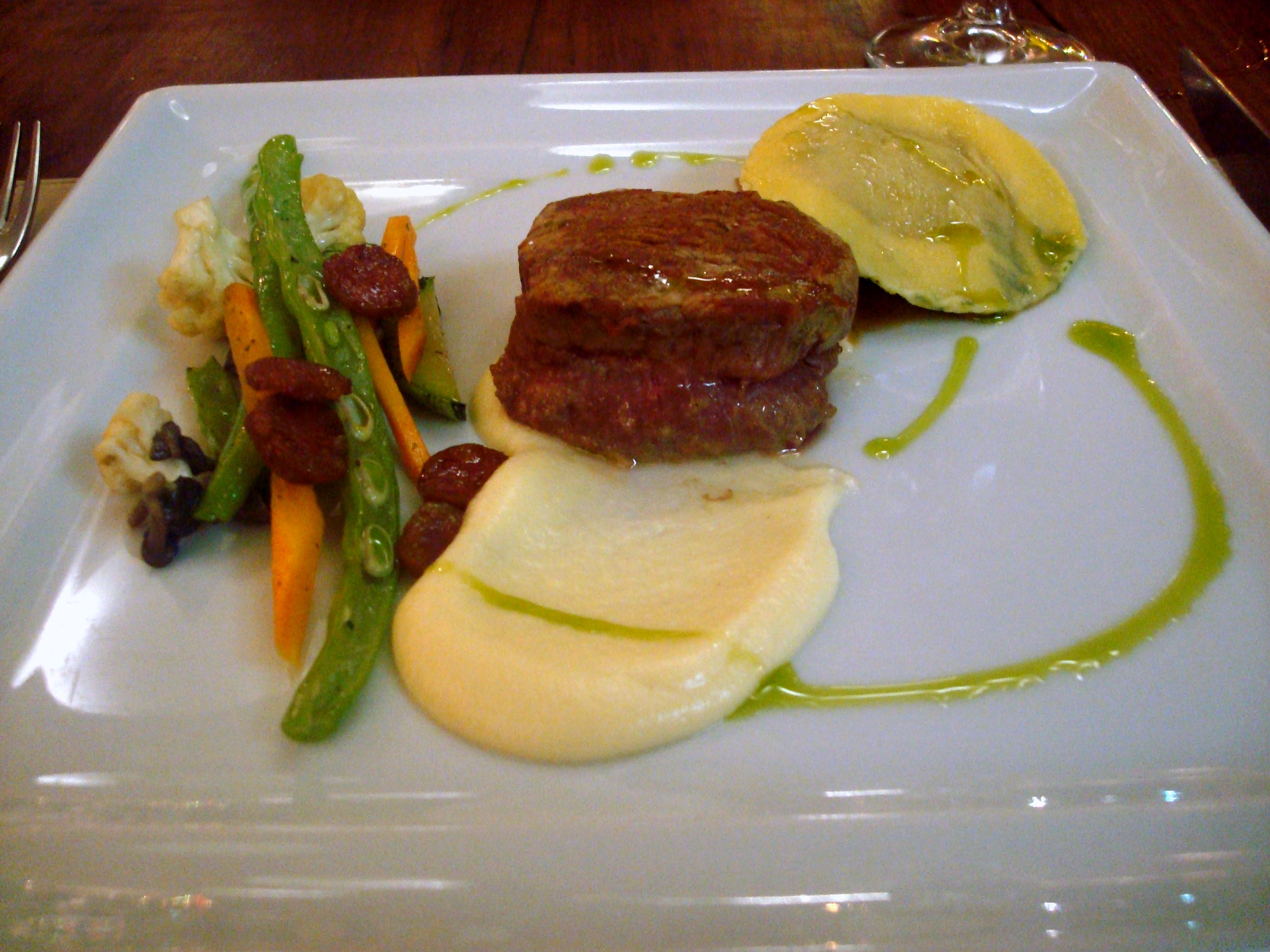Filet grelhado (com chorizo, mousseline de couve-flor, vegetais e ravióli de funghi).