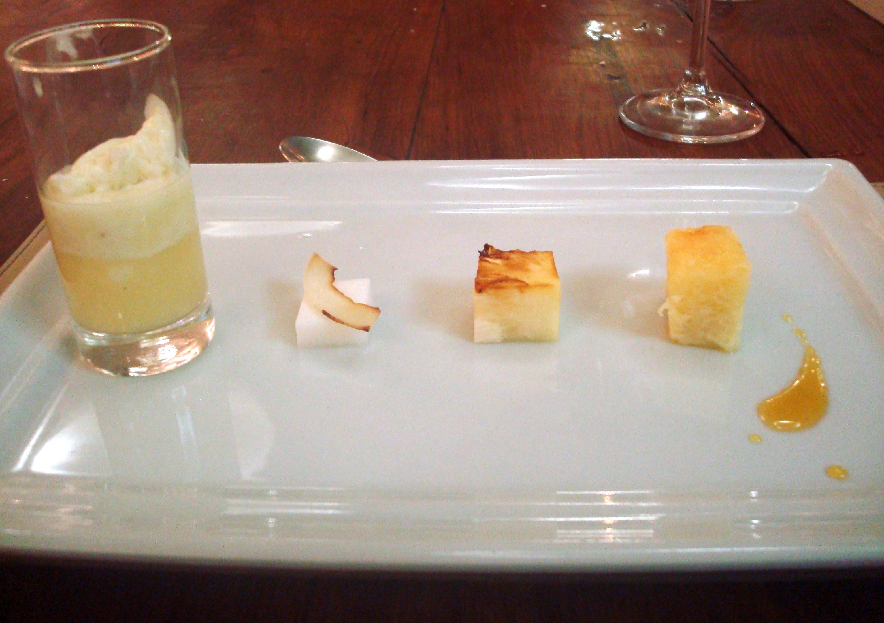 Shooter de Abacaxi (espuma e gelée de coco, abacaxi grelhado e redução de laranja com vanilla).