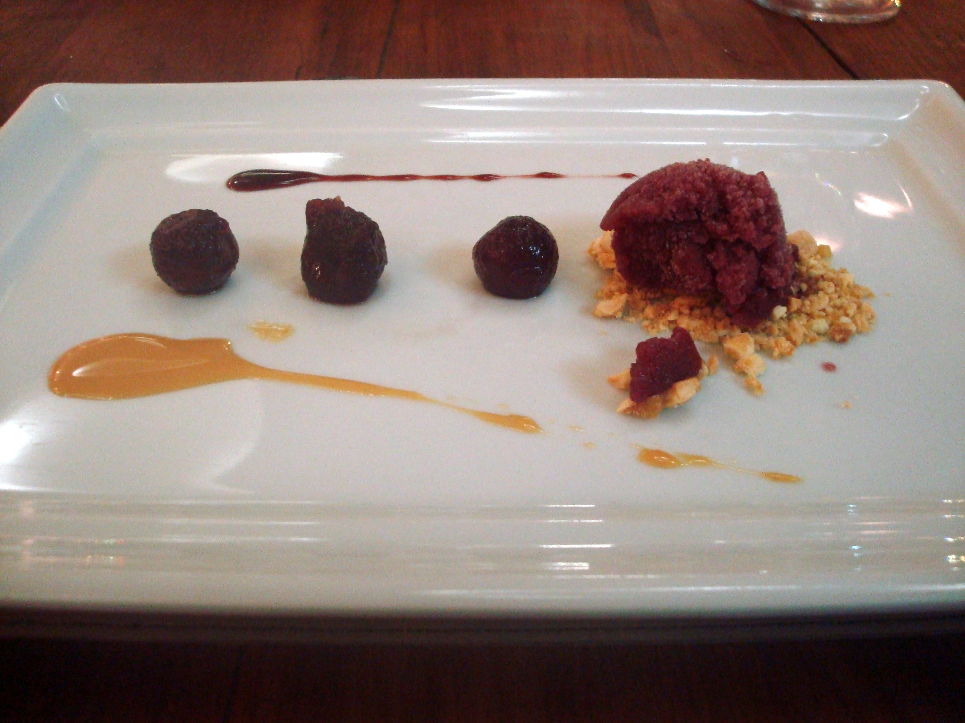 Pêra à pochê (sorbet de vinho tinto, calda de caramelo, redução de porto e crocante de amêndoas).
