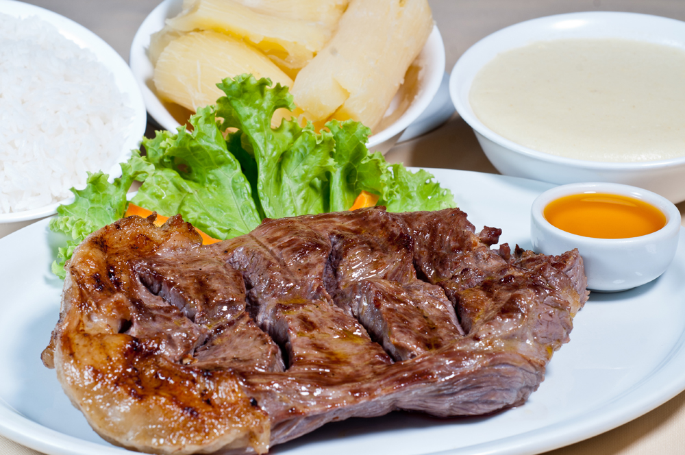 Descrição do prato: suculento corte de beff de ancho grelhado no fogo alto da churrasqueira, servido na chapa com couve-flor à dorê e batata corada, acompanhado de arroz a moda mineira.