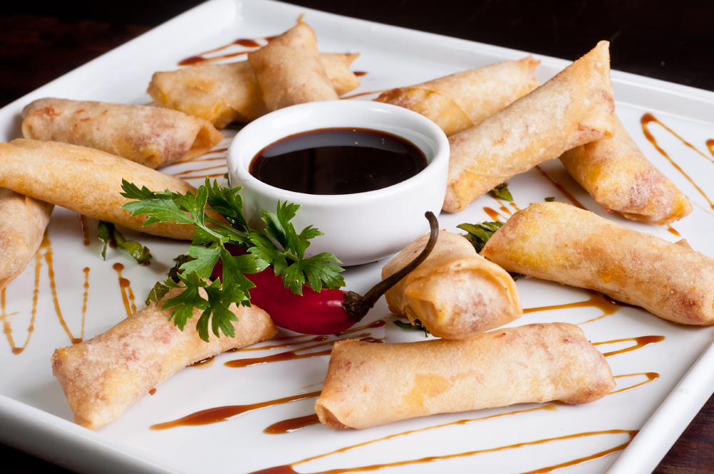 Descrição do prato: delicados rolinhos de massa harumaki com uma mistura exótica de banana da terra, carne de fumeiro e cream cheese.